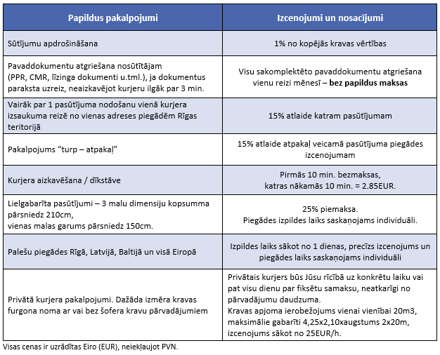 Šajā sadaļā ir apskatāmi visi City Express kurjerpasta papildus pakalpojumi un papildus izmaksas, kuras saistītas ar mūsu kurjerpasta darbību. Papildus piedāvājam sūtījumu apdrošināšanu, pavaddokumentu atgriešanu, krāvēju pakalpojumus, kā arī privātā kurjera pakalpojumus. Privātā kurjera pakalpojumus var Jums sniegt visi kurjeru veidi – velokurjers, motokurjers un autokurjers (ar 3 dažāda lieluma transportu). Precīzāku informāciju skatīties zemāk tabulā.